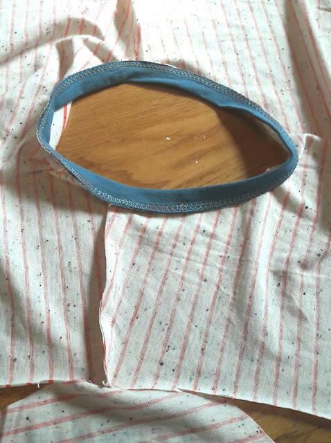 Siis l6ikasin ma paraja jupi kaeluse jaoks - 6cm lai ja kaeluseava pikkune. 6mlesin riba lühikesed otsad kokku nii et moodustus ring. Siis murdsin jällegi servad kokku nii, et parem pool jäi väljapoole, ja 6mblesin lahtised pooled kokku.